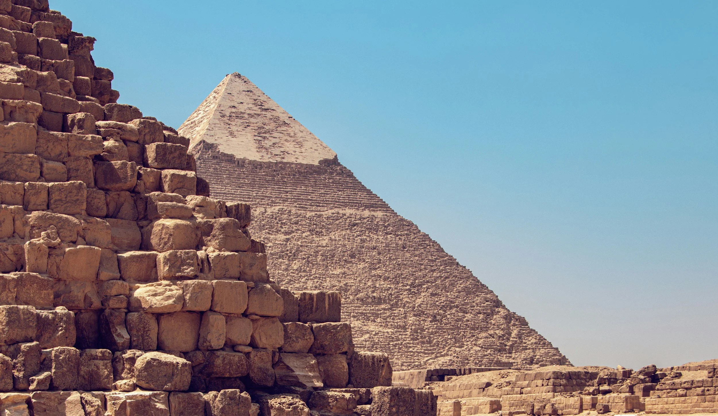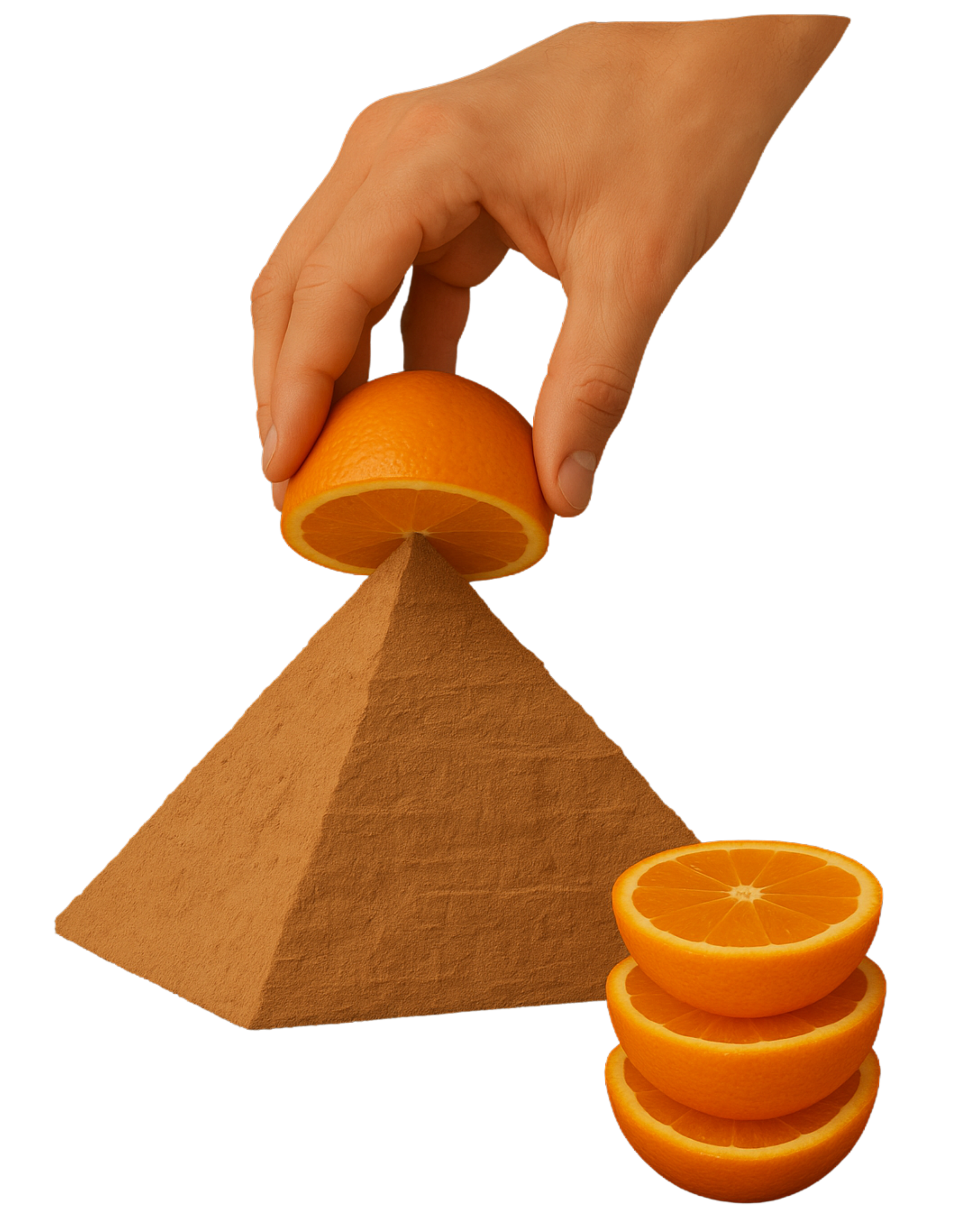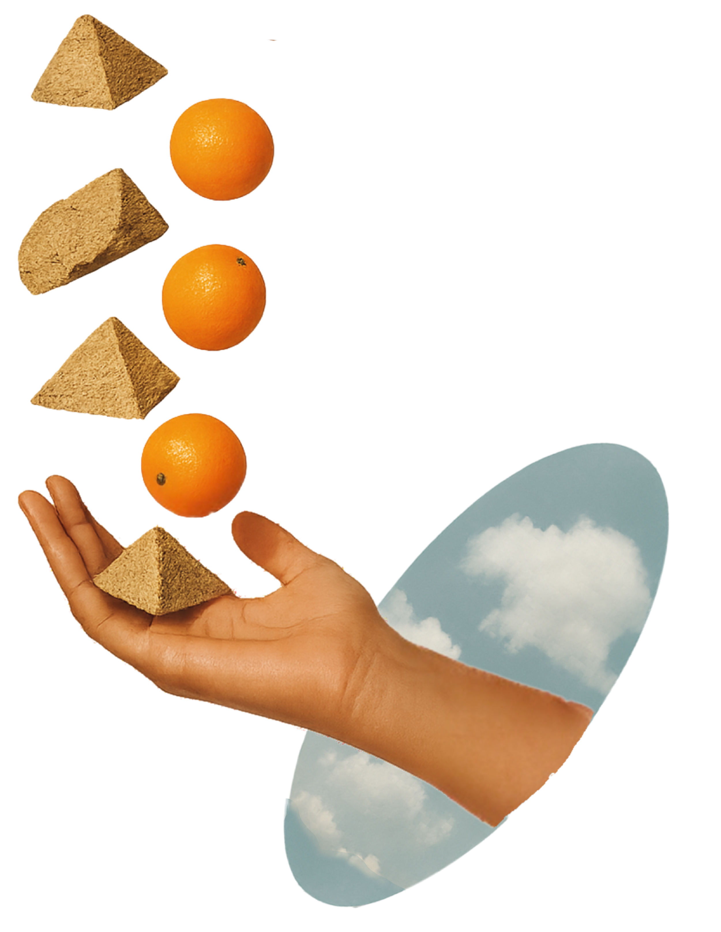 A collage with a hand holding a pyramid-shaped snack, with floating pyramids and oranges above it, and a background of blue sky and clouds.