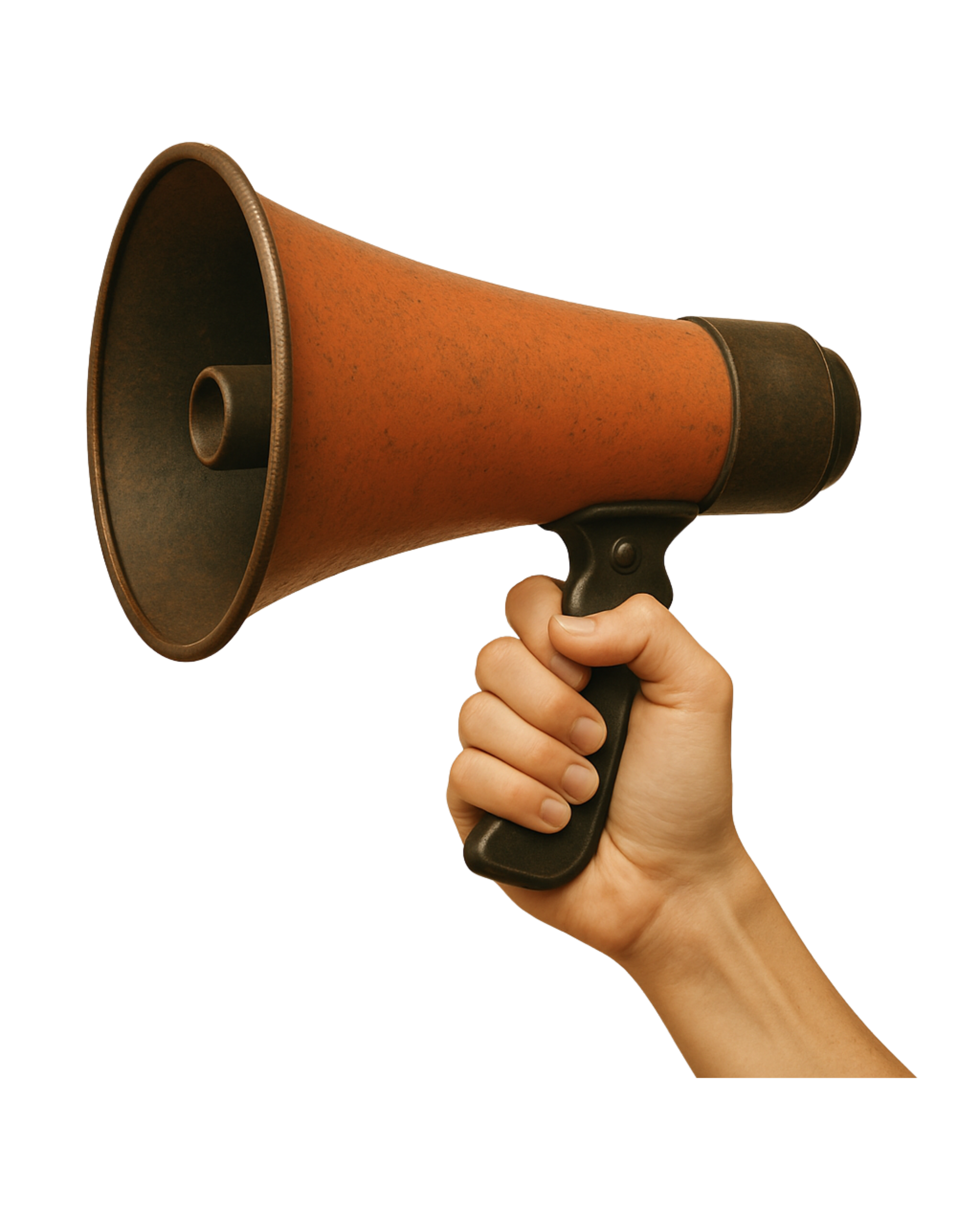 Hand holding a vintage-style orange megaphone with a black handle on a white background.