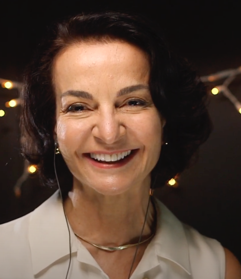 A woman with short dark hair smiling, wearing a white shirt and earrings, with blurred lights in the background.